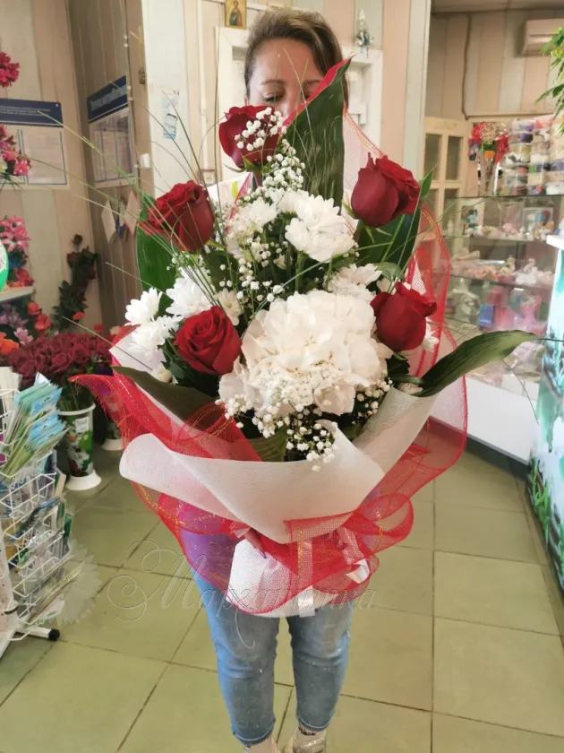 Сборный букет с воздушной, белоснежной гортензией, красными розами и белой хризантемой станет отличным подарком как любимому человеку, так и коллеге