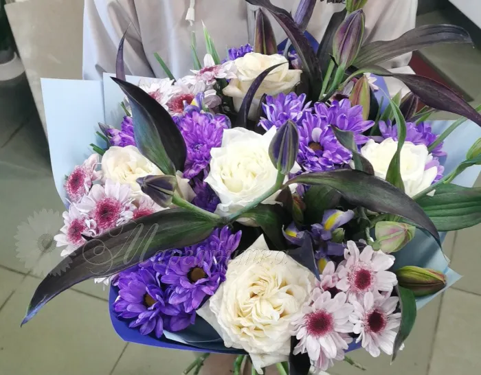 Ароматные лилии в окружении пионовидных роз и хризантем