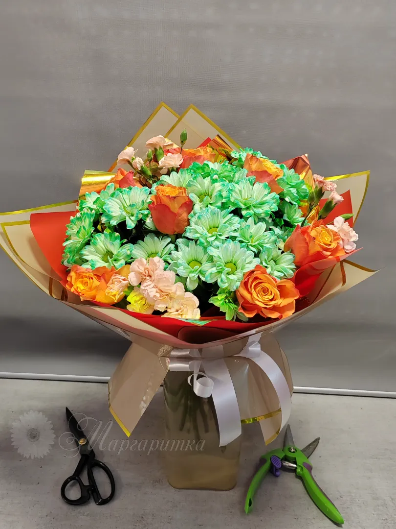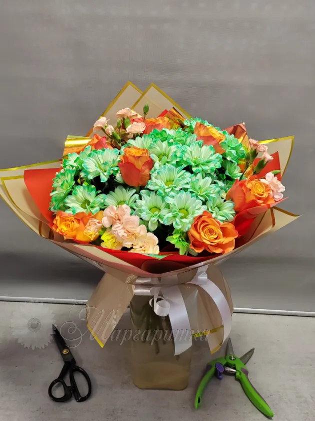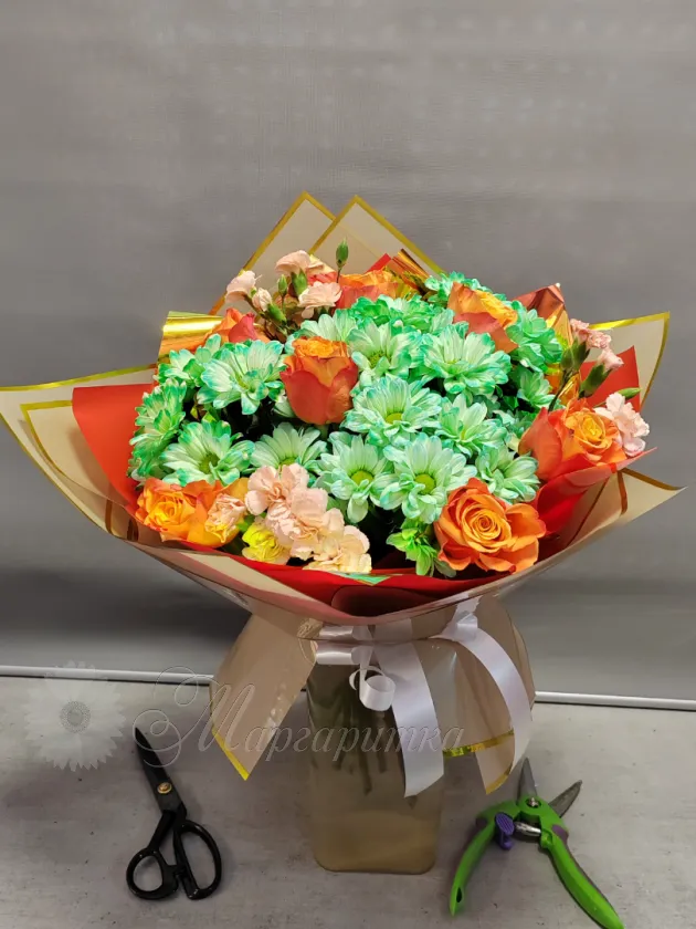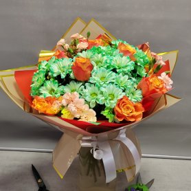 «Солнечный букет из нежных роз и ярких хризантем в оригинальной упаковке. Сочетание тёплых оттенков и свежих зелёных тонов создаёт радостное и праздничное настроение. Идеальный подарок для тех, кто любит яркие и оригинальные композиции.»