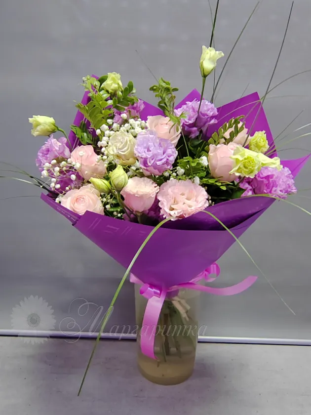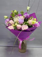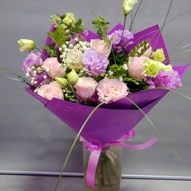 Букет, состоящий из нежных роз и гвоздик розового и фиолетового оттенков, дополнен свежей зеленью. В композиции использованы воздушные гипсофилы, добавляющие легкость и воздушность букету. Он идеально подходит для выражения нежных чувств и станет прекрасным подарком для близких.