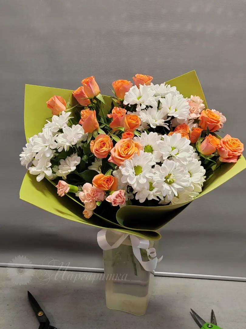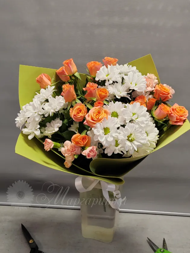 Букет, созданный с любовью и заботой, представляет собой прекрасное сочетание розовых роз, белых хризантем и других цветов, подчеркивающее изящность и свежесть. Нежные оттенки лепестков создают гармоничный образ, наполняя пространство теплом и уютом. Этот букет станет прекрасным подарком для самых дорогих людей.
