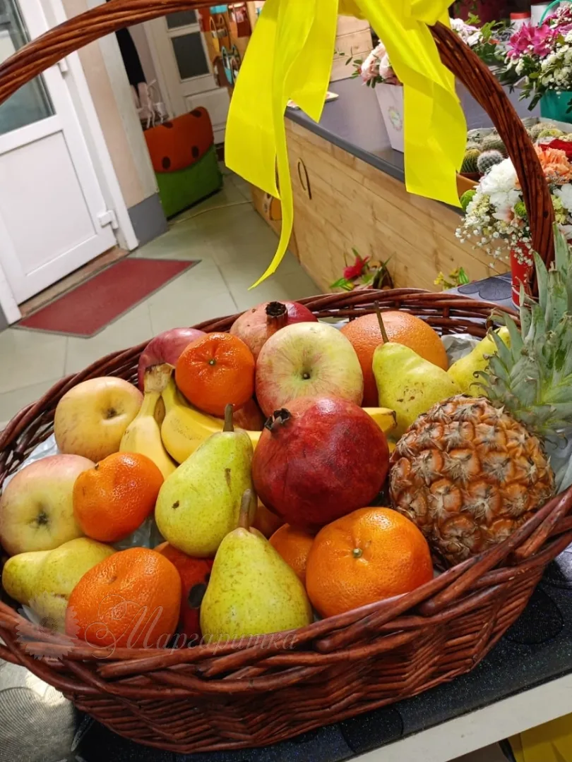 Бананы - 6 шт Виноград - 1 шт Яблоки - 5 шт Ананас - 1 шт Мандарины - 7 шт Апельсины - 3 шт Корзина