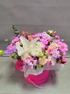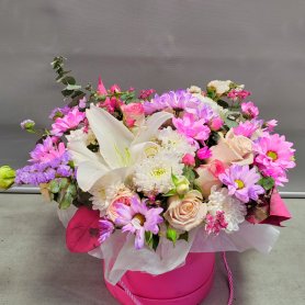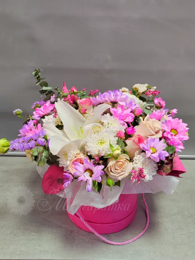Букет представляет собой яркую и нежную композицию в розовой шляпной коробке, украшенную белыми лилиями, розовыми розами и разноцветными ромашками. Упаковка с изящным бантом и декоративной бумагой добавляет работе элегантности, делая её прекрасным выбором для подарка или особого случая.