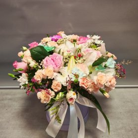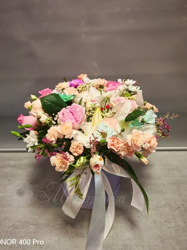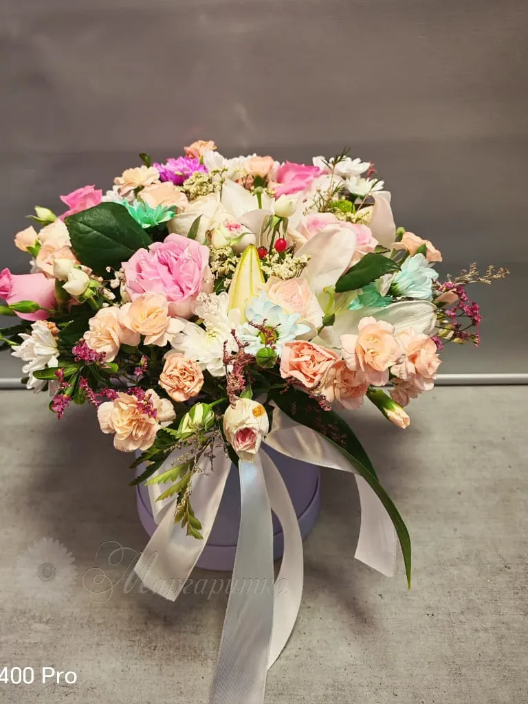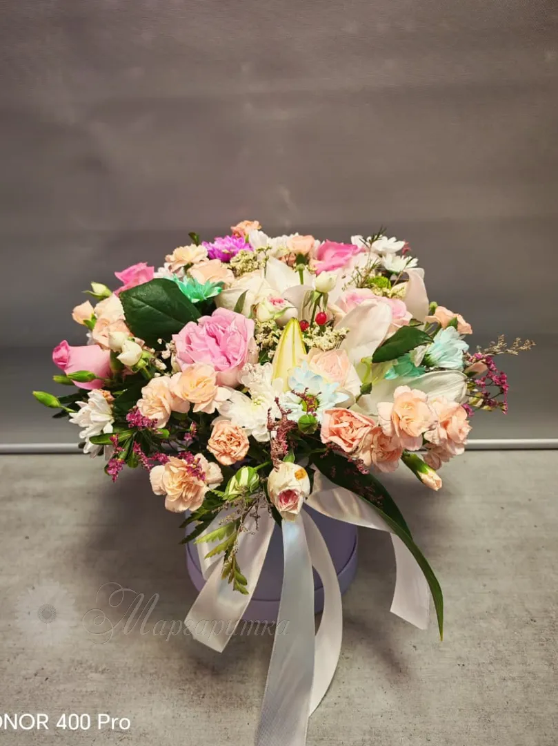 Нежный букет в пастельных тонах, составленный из разнообразных цветов, таких как розы и лилии, идеально подойдёт для выражения признательности и тёплых чувств. Букет, оформленный в элегантную коробку с атласной лентой, станет прекрасным подарком для любого торжества.