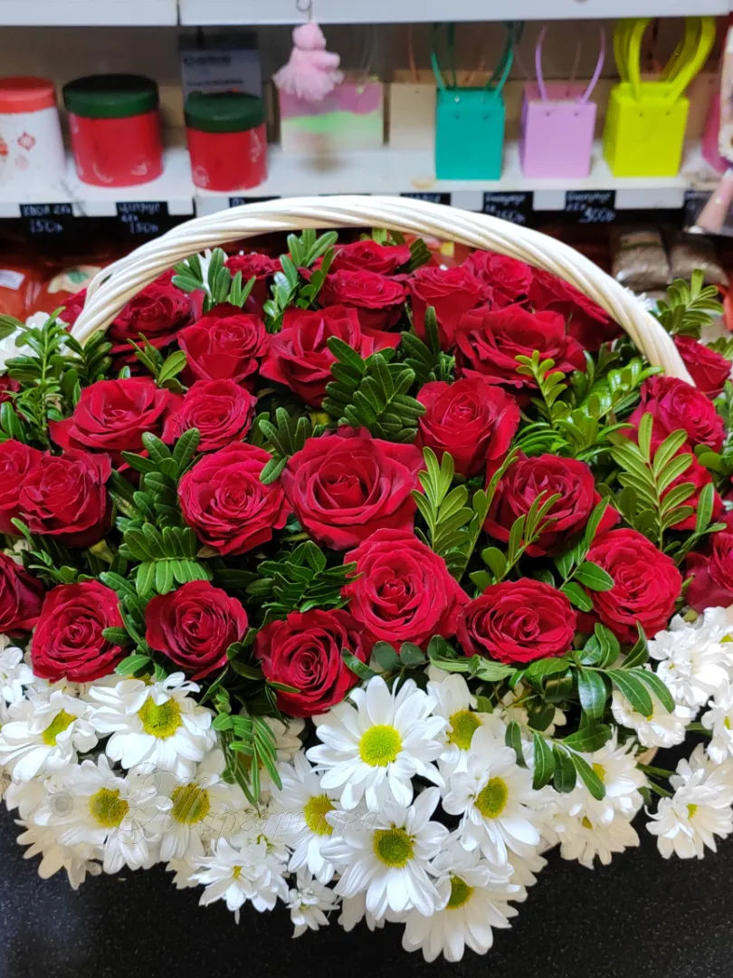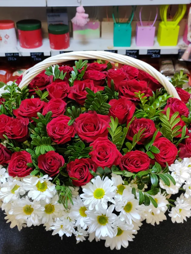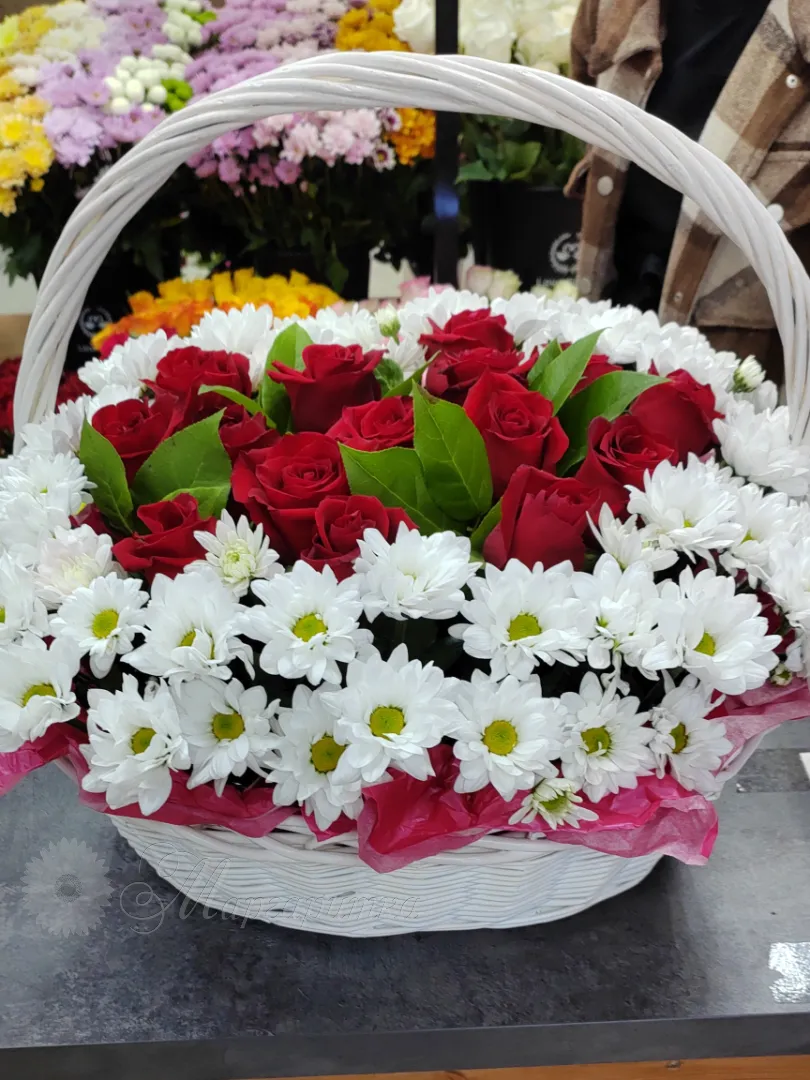 Кустовая хризантема - 5 шт Роза - 9 шт Зелень Корзина