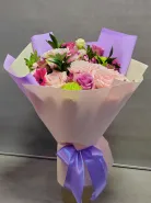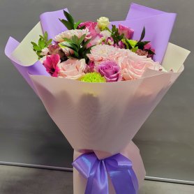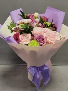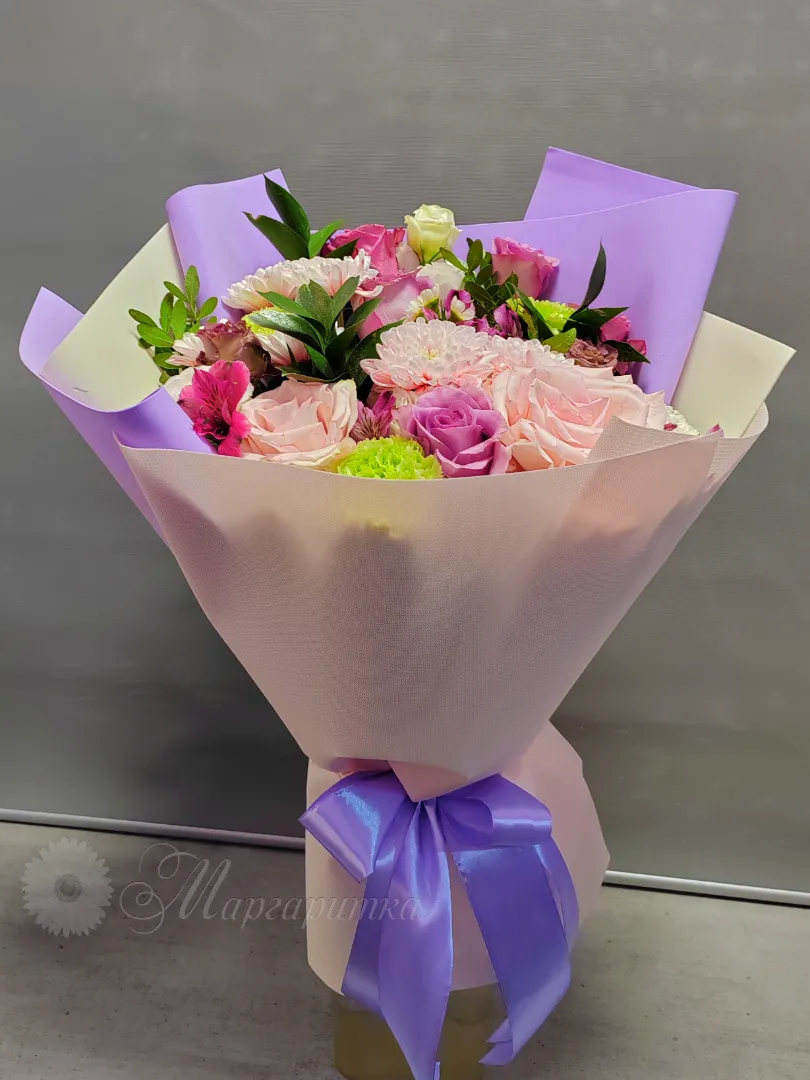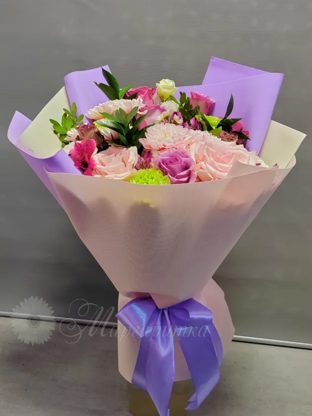 Букет представляет собой нежную композицию из розовых и фиолетовых роз, дополненную зеленью и другими цветами, создавая воздушный и элегантный образ. Бумажная упаковка с лентой добавляет ему элегантности. Этот букет идеально подходит для выражения нежных чувств и является прекрасным подарком для близких, наполняя пространство светлой радостью и добротой.