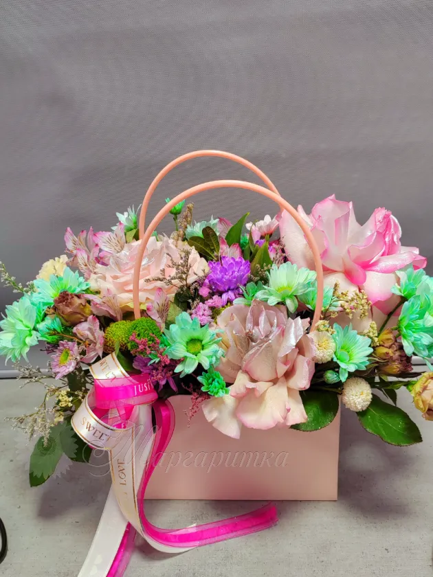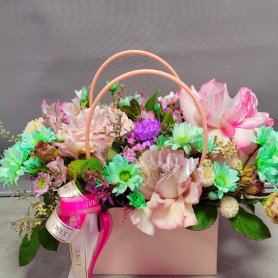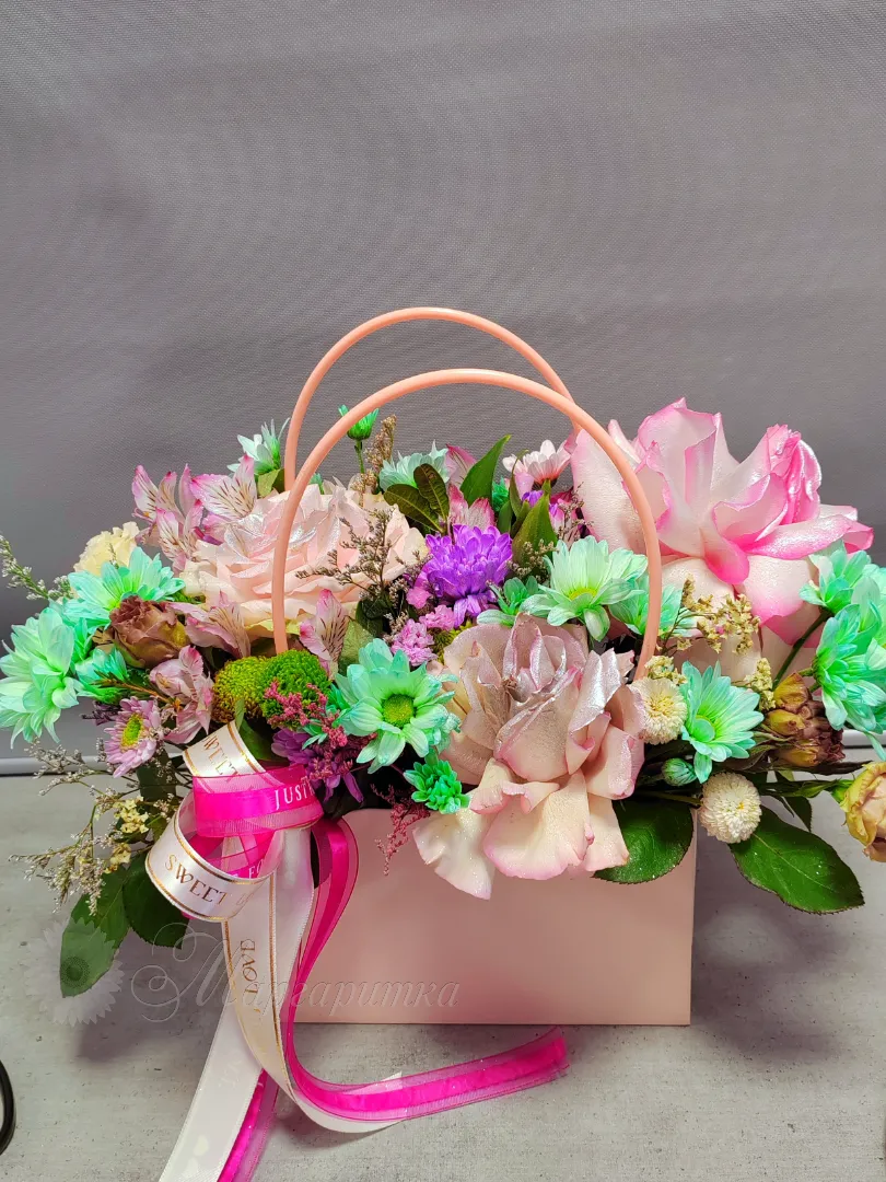 Описание букета Нежный букет в светло-розовой корзине, украшенный яркой лентой с трогательными надписями « ». Композиция из разнообразных цветов в пастельных оттенках создает воздушную и романтичную атмосферу, идеальную для выражения любви и заботы.