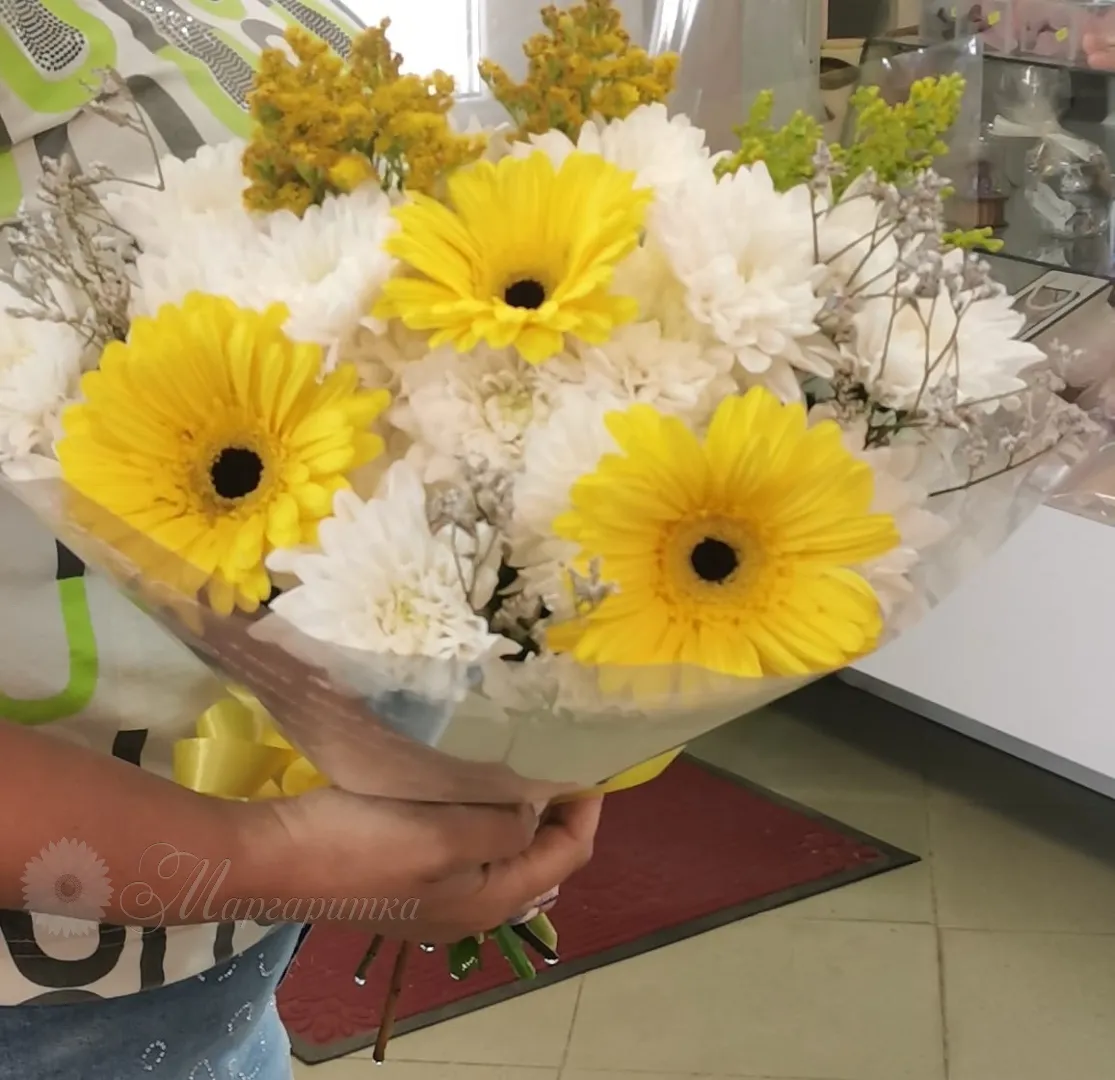 Милый букет с герберами и хризантемой для солнечного настроения