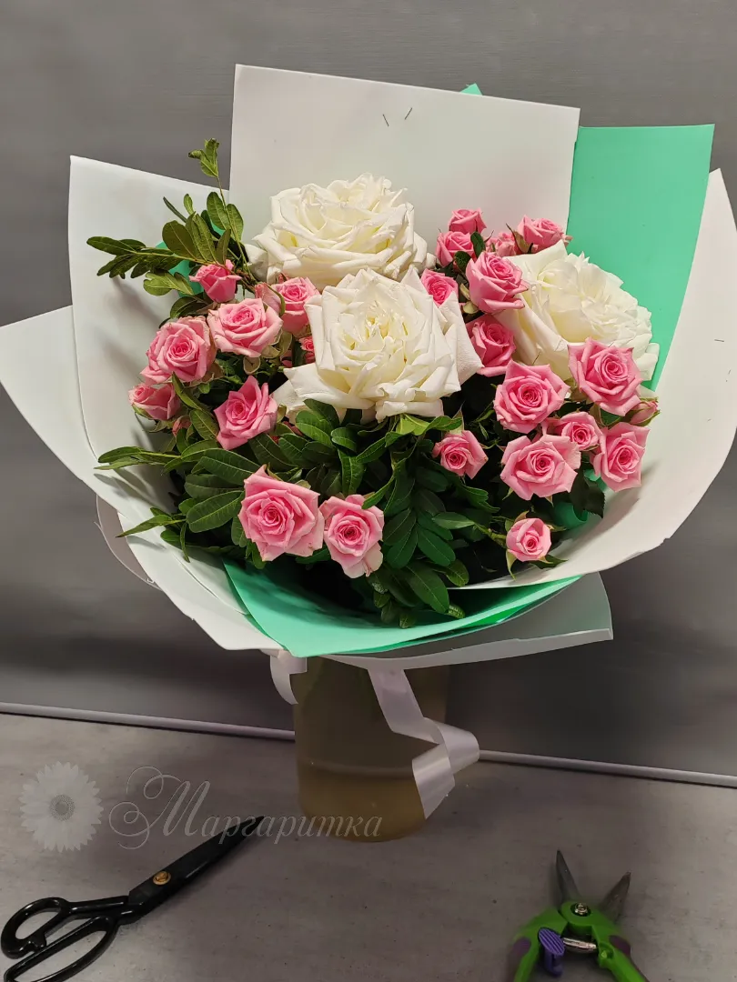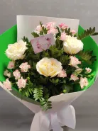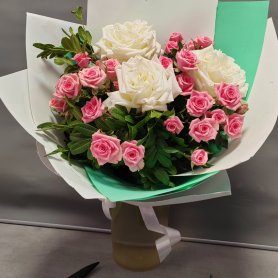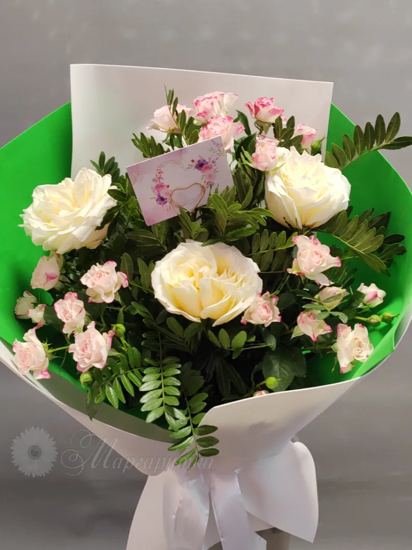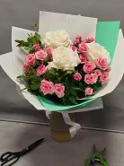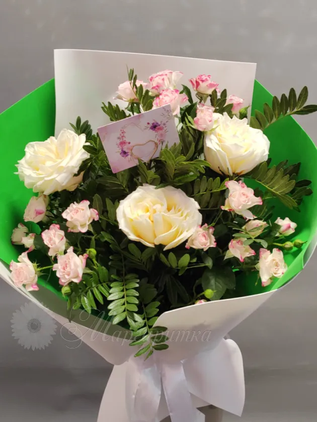 Описание букета: Нежный букет, состоящий из крупных белых роз и маленьких розовых роз, станет прекрасным подарком для близкого человека. Сочетание цветов и форм создает элегантный и романтичный образ, идеально подходящий для любого торжественного случая. Букет красиво оформлен в белую упаковку с добавлением зеленого акцента, что подчеркивает его свежесть и изящество.