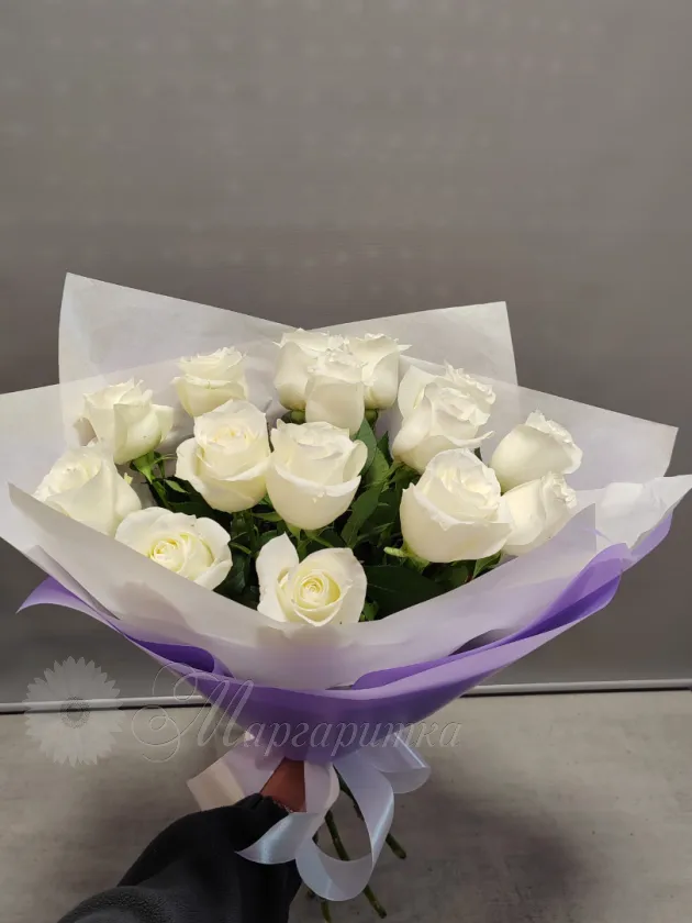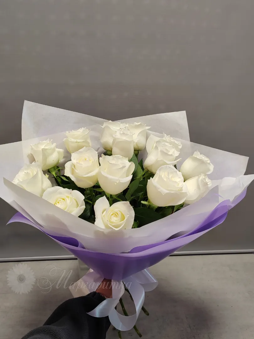 Букет, состоящий из нежных белых роз, элегантно завёрнутый в лиловую бумагу и дополненный белой лентой, создаёт образ утончённости и гармонии. Белые розы символизируют чистоту и искренность, делая композицию прекрасным выбором для любого торжественного случая. Этот букет станет изысканным подарком, выражающим самые светлые чувства.