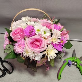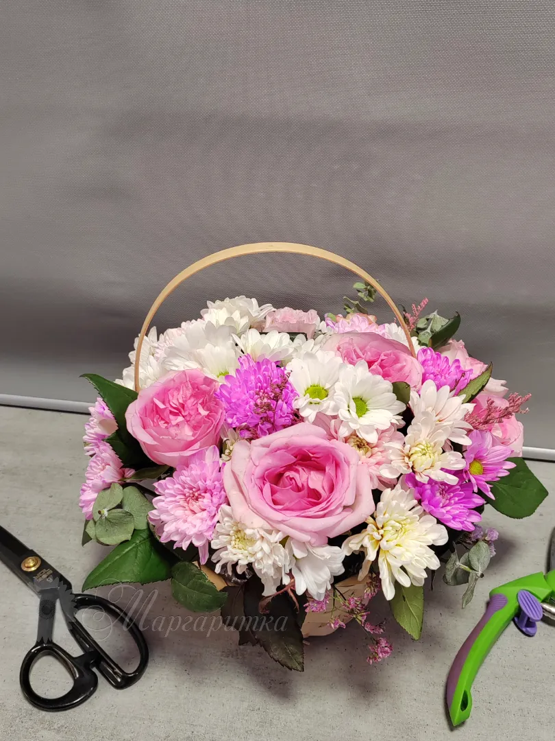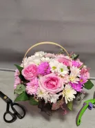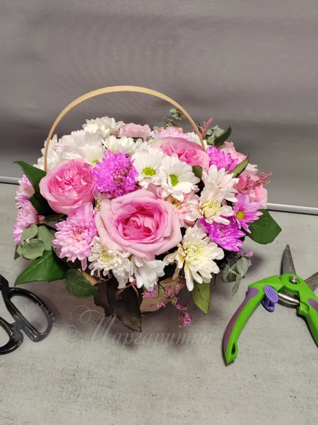 Нежно-розовый букет в светлой корзине станет идеальным дополнением к любому празднику. Розы и хризантемы в воздушных оттенках создают атмосферу лёгкости и уюта, а обрамляющие зелёные листья добавляют композиции свежесть и природную гармонию. Этот букет станет прекрасным выбором для подарка или украшения дома